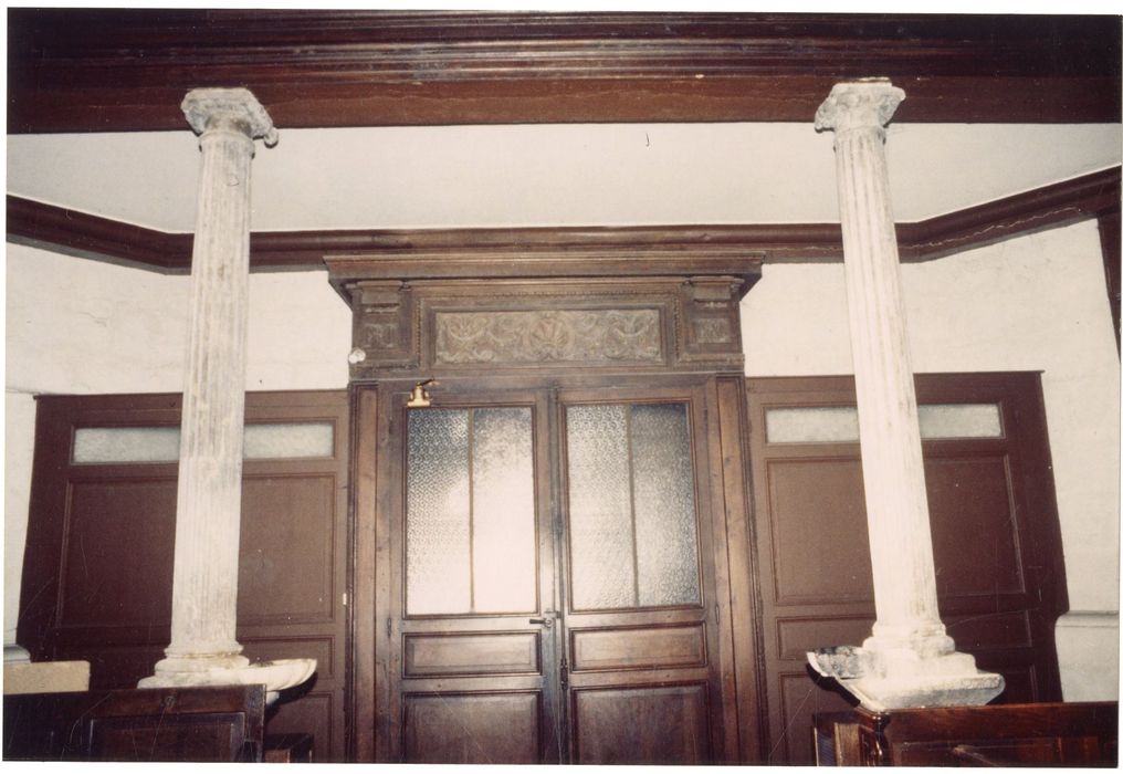 lambris de demi-revêtement ; tambour de porte ; tribune ; banc d'oeuvre