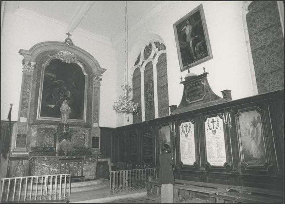 Le banc d'oeuvre est situé dans la nef, mur sud. Le tambour de la porte principale a son fronton sculpté. La tribune est située au-dessus de l'entrée ouest. la tribune est soutenue au centre par deux colonnes en pierre et aux extrémités par deux colonnes encastrées en bois imitation marbre.