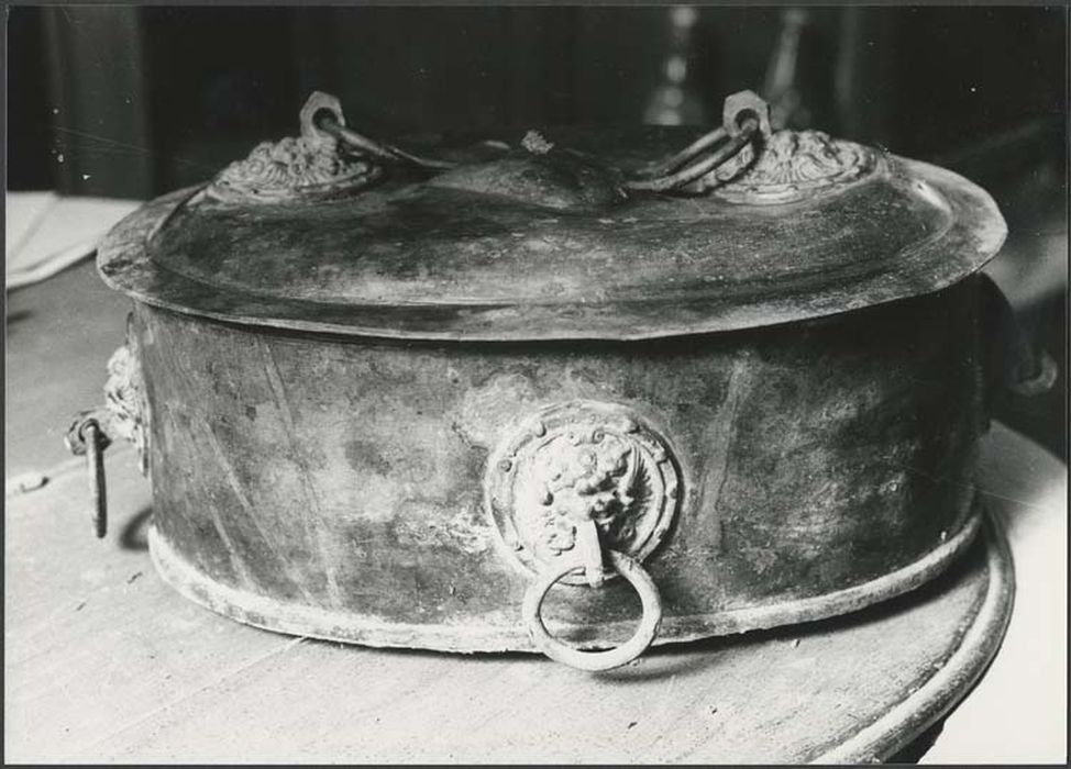 Cuve ovale sans cloisonnement à l'intérieur. A l'intérieur : une boite en étain avec couvercle sur lesquels sont ornés des mufles de lion tenant les anneaux. Le couvercle comprend également un coeur repoussé.