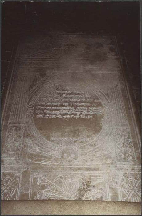 Dalle rectangulaire, dans le pavage du choeur. Epitaphe funéraire dans un cartouche circulaire au centre, surmonté d'une tête d'angelot ailée et en dessous, une tête de mort, et encadrement décoratif architectural gravés. Monogramme du défunt. Les armoiries et le texte ont été martelés.