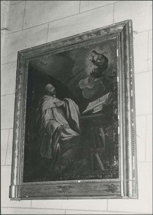 Ce tableau fut réalisé d'après une gravure de Jean Morin (Paris, 1605-1650, élève de Philippe de Champaigne), elle-même réalisée d'après un original aujourd'hui disparu de Philippe de Champaigne "Saint Bernard priant" de 1648, conservé avant la date de 1711 à Port-Royal des Champs. Une copie de la première moitié du 19e siècle a été exécutée d'après cette gravure par François-Vincent Latil pour l'église de Saint-Etienne-du-Mont (Paris) où elle se trouve encore actuellement. Cette "Apparition de la Vierge à saint Bernard" a-t-elle été réalisée par ce même Latil (1796 ou 99 - 1890) ? Ce tableau, s'il reprend exactement le motif et l'attitude du saint, la table d'écriture avec les livres en rayons et les faisceaux lumineux provenant d'une nuée, en diffère pourtant en partie haute par la représentation de la Vierge à l'Enfant et de la Colombe dans un rai de lumière. La Vierge semble pour sa part inspirée de la "Vision de saint Bernard" de Vicente Carducho (dit aussi Vincenzo Carducci ou Carduccio, 1576 ou 78 - 1638) réalisée en 1634 et conservée au Musée de Santa Cruz à Tolède (Espagne). L'attitude et la figuration de la Vierge sont similaires, ainsi que la gloire rayonnante et la nuée qui l'entourent (excepté l'absence de putti dans la version du 19e siècle).