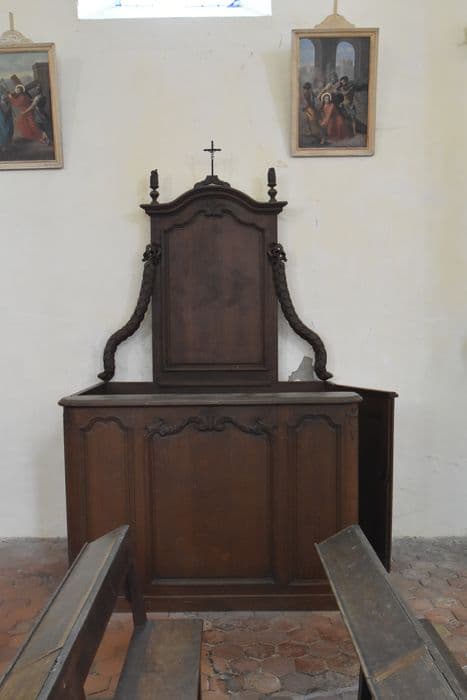 Banc à panneaux moulurés ; le dossier est plus étroit que le banc ; des guirlandes relient les bords extérieurs de ces deux éléments. Le dossier porte deux pots à feu ; il reste à son sommet la base d'une ornementation, probablement une croix.