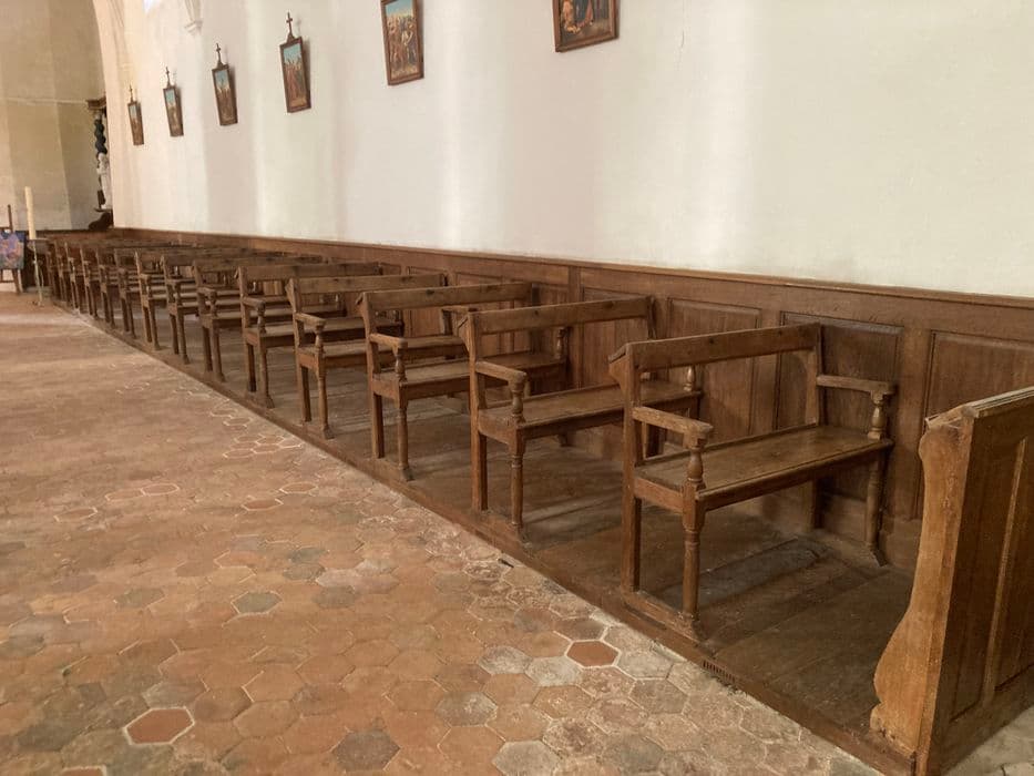 L'ensemble des bancs forme un tout homogène. Les bancs sont fixés sur un plancher en bois. Les bancs de la nef (vingt-huit) sont plus longs que ceux des bas-côtés (dix-neuf côté nord, dix-sept côté sud). Chaque banc est de plan rectangulaire, d'élévation droite, et repose sur quatre pieds, ceux de devant sont tournés, ceux de l'arrière sont de base carrée et se prolongent en tant que montants du dorsal. Le dorsal est composé d'une simple traverse haute, formant au revers un étroit pupitre. Les accoudoirs sont à angle droit, le montant est de forme balustre en bois tourné.