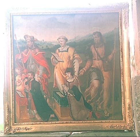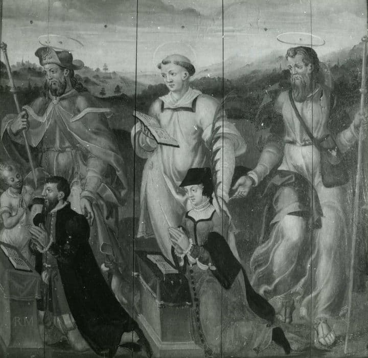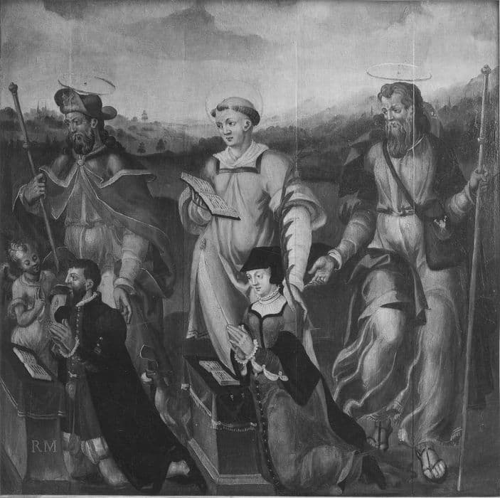tableau : Donateur et donatrice accompagnés de leurs saints patrons, saint Roch, saint Etienne et saint Jacques