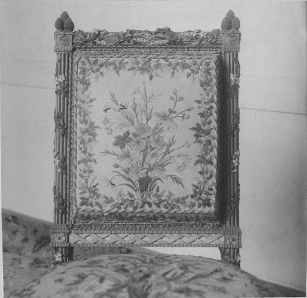 Mobilier comprenant 2 chaises de forme rectangulaire, 2 fauteuils de forme rectangulaire, 1 tabouret de pied en bois peint d'osier, orné de fleurs, de rubans et d'attributs champêtres sculptés et peints au naturel recouverts de basin blanc brodé en laine de fleurs des champs, 1 écran orné à la traverse supérieure d'une houlette et d'un thyrse lié par des rubans, des couronnes de fleurs, du lierre et des jasmins, au bas des montants, 2 masques humains au naturel.