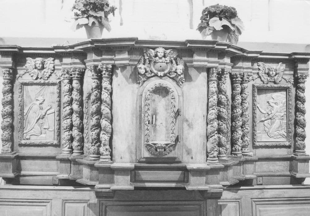 Tabernacle en forme d'un rectangle allongé avec au centre une partie en saillie constituant le tabernacle proprement dit à 3 côtés décorés chacun d'une niche et cantonnés de colonnettes jumelées et torsadées avec décors de grappes de raisin. De part et d'autre, une partie plane délimitée par une dernière colonne torsadée est ornée en son centre d'un panneau en bois doré représentant, l'un la Vierge de l'Annonciation, l'autre l'ange Gabriel. Chacun des personnages est en bas relief ; il est doré en partie