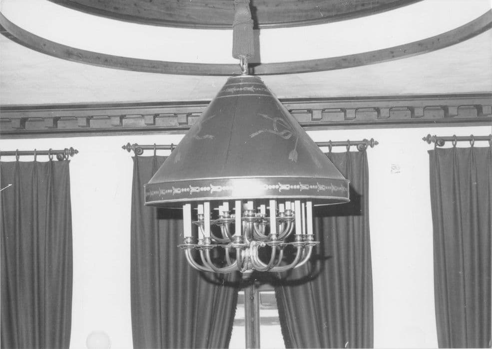Bois vernis noir, bronze doré, tôle. Lustre à deux couronnes de bras de lumière ; douze bras de lumière par couronne. Abat-jour en tôle peinte.