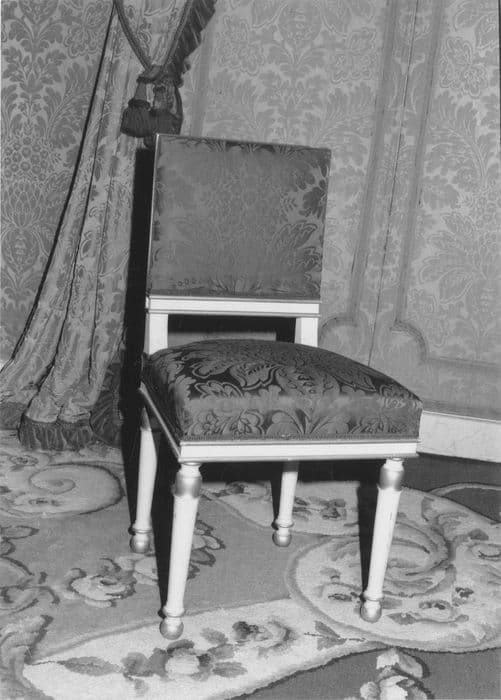 Chaises et fauteuils en bois peint en blanc et doré ; pieds en forme de balustre sur roulette ; damas rouge.