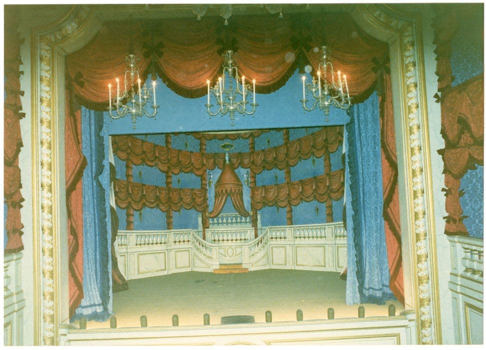Rideau de scène en damas bleu surmonté d'un manteau d'Arlequin en damas rouge.