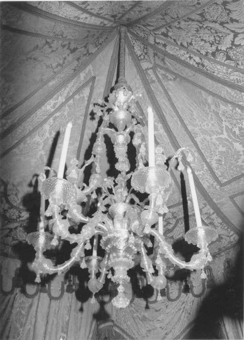 Un lustre central : parterre ; un lustre : loge d'honneur ; trois demi-lustres : devant de scène ; seize lustres en applique : loges.