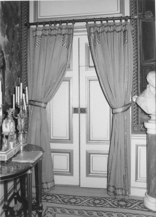 Trois paires de portières en soie bleue bordées d'un galon avec motifs de rinceaux ; motifs 'parapluie' aux quatre angles.