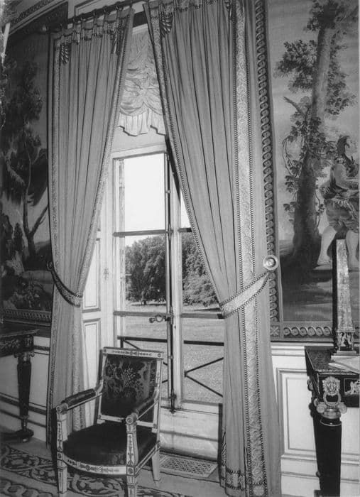 Soie bleue cannetillée. Galon. Ces rideaux sont réalisés comme pour les deux canapés et les portières en soie bleue bordée d'un galon à motifs de rinceaux. On yretrouve aussi dans les quatre angles le motif 'parapluie' du tapis de cette galerie.