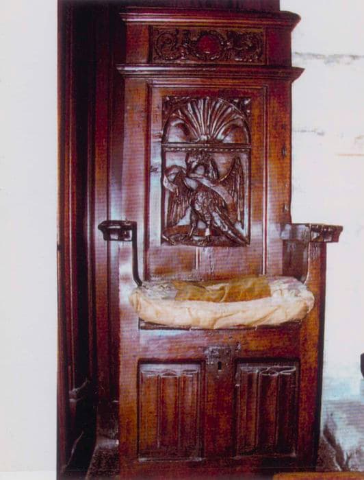 Chaire à haut dossier. En partie basse du siège se loge un coffre dont le couvercle monté sur charnière forma siège. L'entrée de serrure est en fer forgé. Les accotoirs sont en bois tourné.