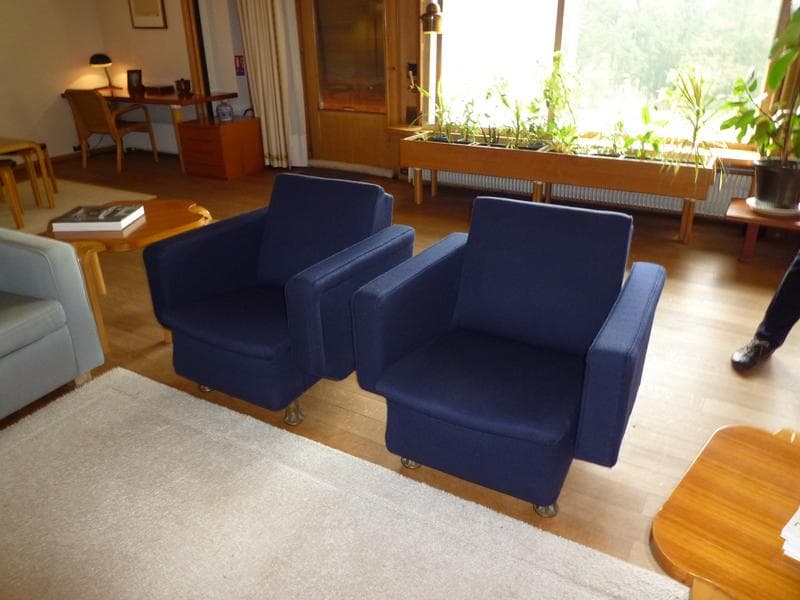 Fauteuils recouverts de tissu bleu dont les pieds sont en métal, en forme d'entonnoir.