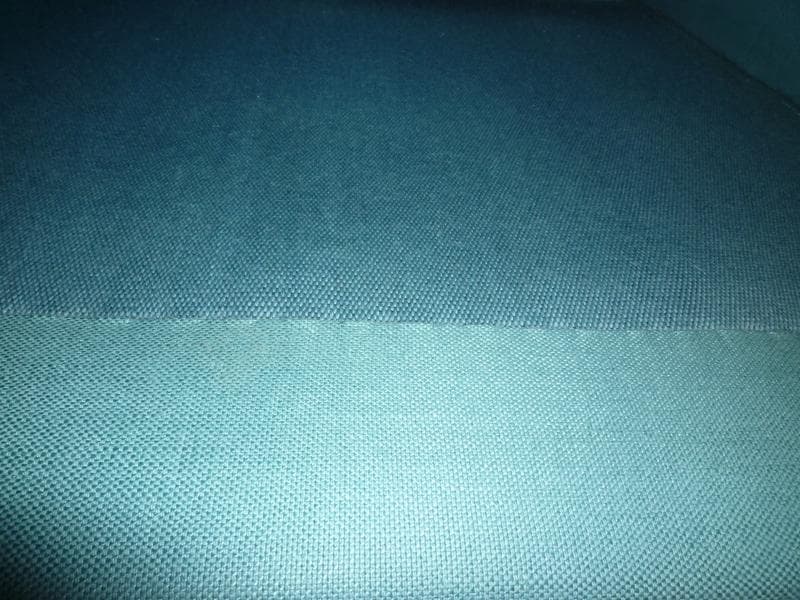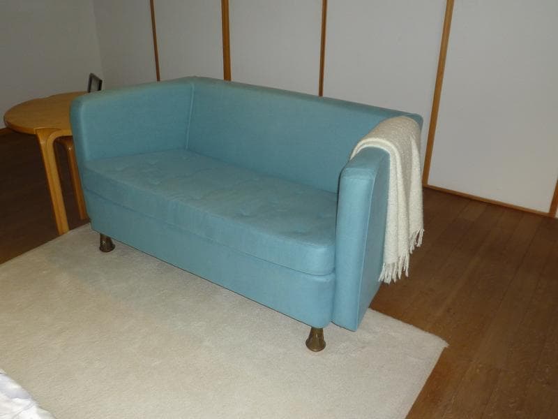 Pieds du canapé en métal, en forme d'entonnoir. Tissu bleu.