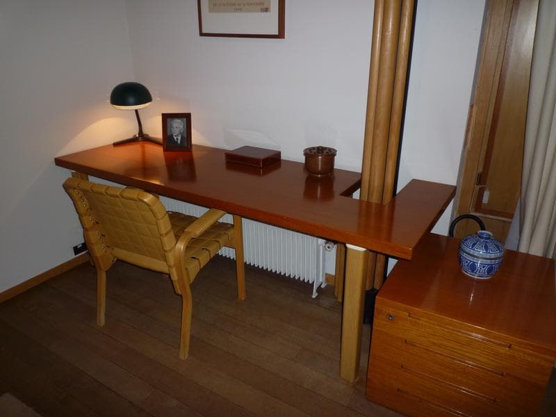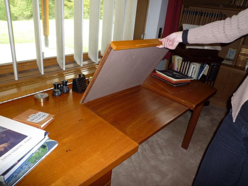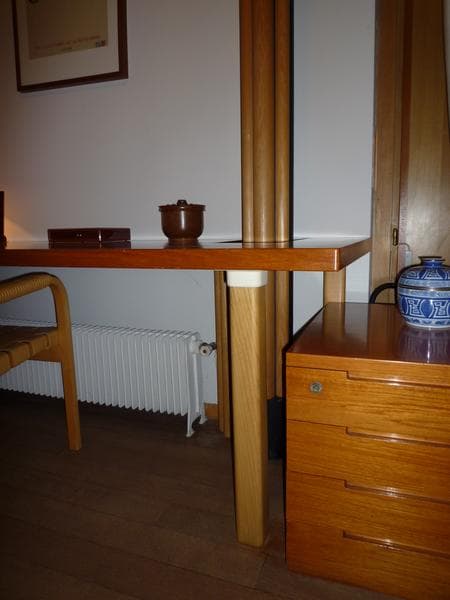 La forme du bureau s'adapte à la structure de la maison. Il vient s'encastrer autour d'un des piliers. Il a des pieds en H et un plateau asymétrique en teck.