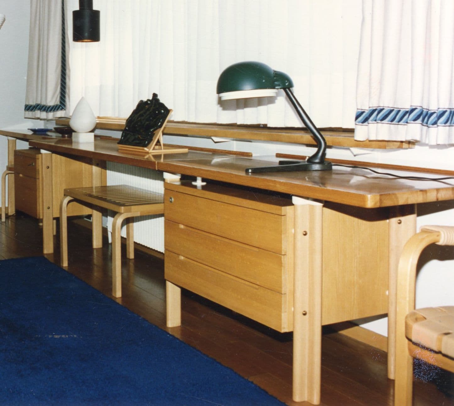Le bureau repose sur un large bloc d'étagères d'un côté et de l'autre sur un bloc de compartiments verticaux destinés à ranger de grands dossiers.