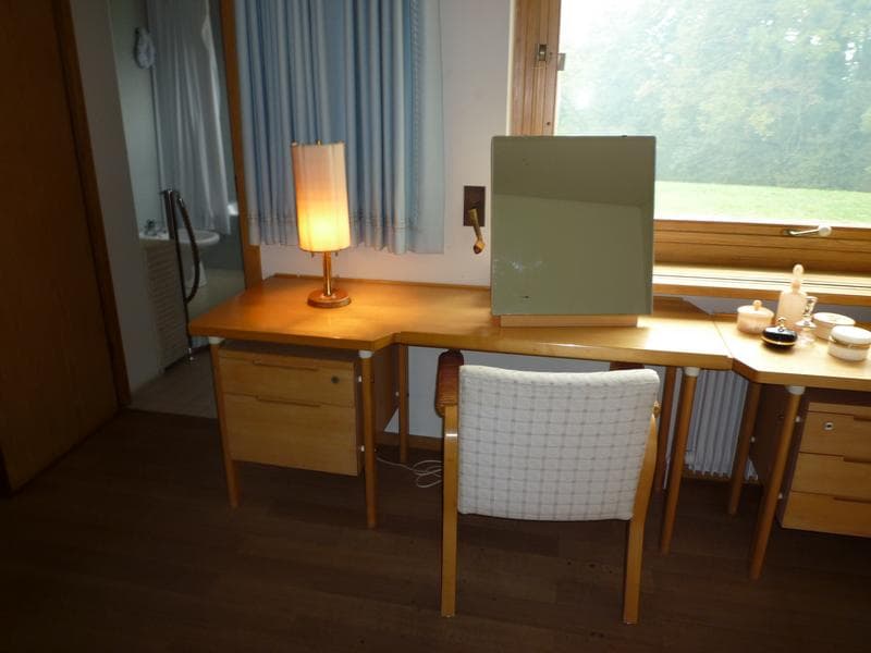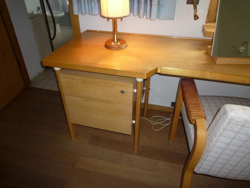 Bureau (table) constituée de deux parties, est pourvue de pieds en H et de deux blocs de tiroirs suspendus.