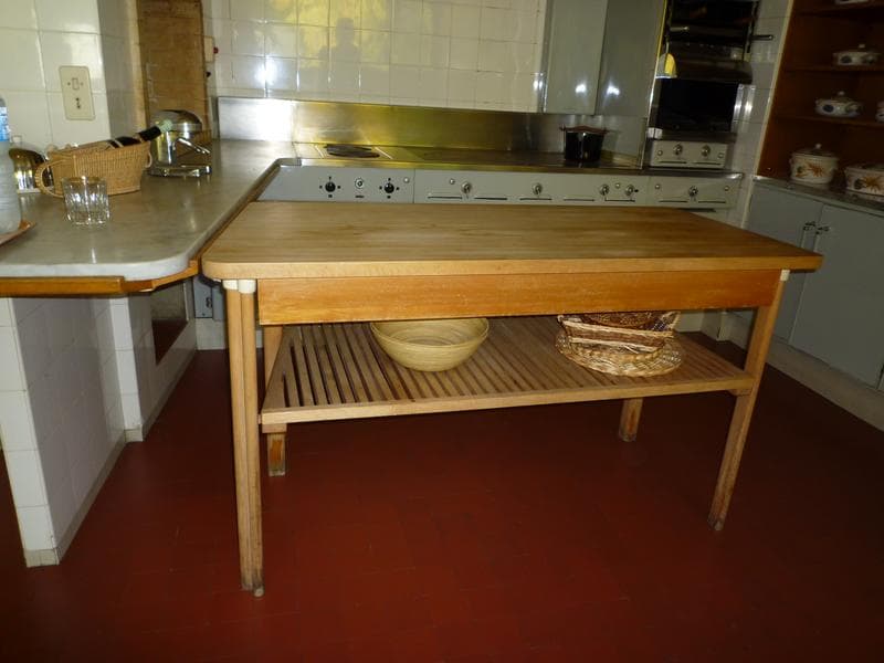 Ce plan de travail est légèrement asymétrique pour épouser la forme des plans de travail en place. Il a des pieds en bouleau, un plateau en frêne, une étagère grillagée et deux tiroirs.