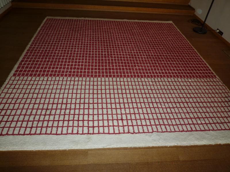 Le tapis comporte des motifs rectangulaires rouges sur fond écru.