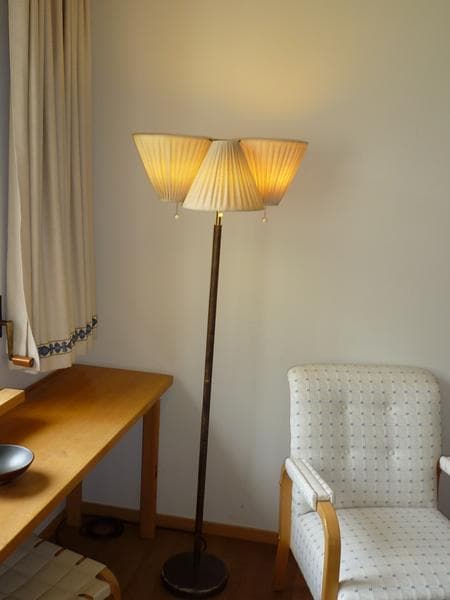 Lampadaire sur pied avec abat-jour en lin ; piétement gainé de cuir noir.