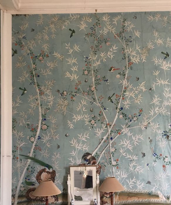 Papier peint posé sur une toile tendue sur des tasseaux de bois. Catégorie oiseaux et fleurs : sur un fond bleu uni des bambous s'enroulent autour d'arbres à fleurs, présences de pivoines, de belles de jours, d'orchidées, de chrysanthèmes, d'oiseaux, d'insectes et de papillons. La liaison entre les lés se fait par des papillons et des feuilles de bambous.