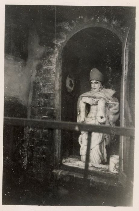 La statue du personnage principal est couverte d'un badigeon blanc sous lequel on distingue encore quelques traces de polychromie.