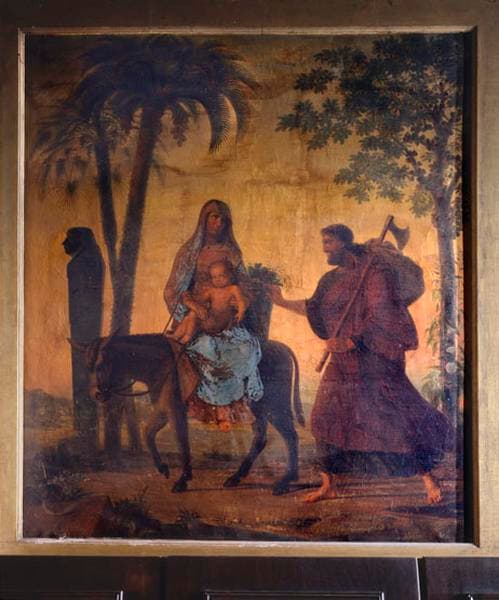 Saint Joseph, tenant une hache, marche près de la mule qui transporte la Vierge et l'Enfant Jésus. La scène se passe sur fond de paysage avec des arbres et un sarcophage debout sur la gauche.
