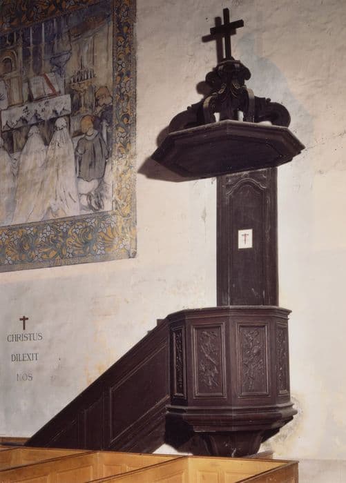 Chaire à prêcher présentant une cuve à panneaux sculptés de trophées liturgiques, un escalier droit à rampe à panneaux moulurés et un panneau dorsal également mouluré. L'abat-voix est amorti d'une croix sur piètement à volutes.