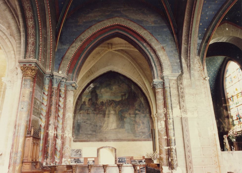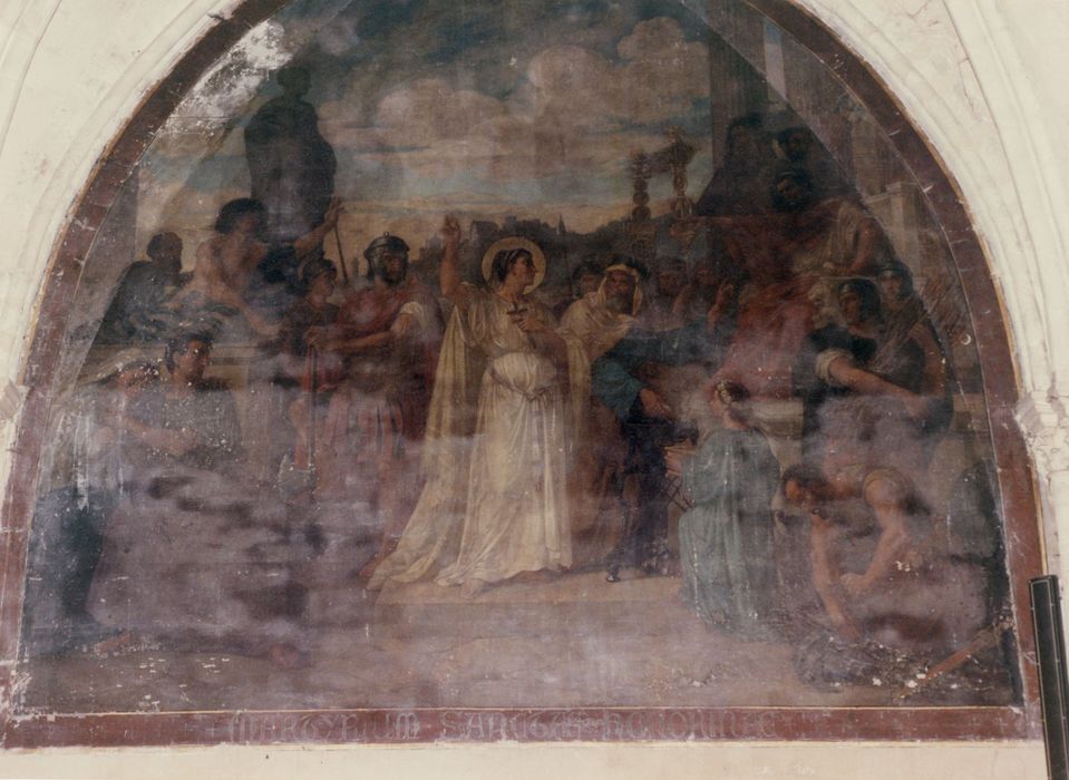 La commande faite à François Grellet répond au souhait de l'abbé Lefèvre, exprimé dans son testament, de faire réaliser une peinture murale montrant : un tribunal jugeant et condamnant sainte Honorine à être brûlée. La composition du peintre reprend ce thème en montrant l'épisode légendaire où la sainte, refusant de brûler l'encens pour une idole, est condamnée à mort par le proconsul romain.