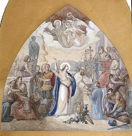 Dessin préparatoire pour la peinture monumentale (toile marouflée) de François Grellet, réalisée en 1874, et placée dans le bas-côté nord de l'église, à proximité de la chapelle Sainte-Honorine. Il s'agit pour l'abbé Valet, curé de Conflans à partir de 1871, de continuer l'oeuvre de transformation de l'église et la réalisation d'une chapelle dédiée à la sainte, commencée par son successeur l'abbé Lefèvre, dans le but de faire de l'église un grand lieu de pèlerinage. Le peintre François Grellet, formé par son frère Alexandre et par Barrias, Frère de la Doctrine Chrétienne à Paris entre 1853 et 1871, réalise de nombreux tableaux religieux ou d'histoire, ainsi que de grands décors (Passy, cathédrale de Beauvais, Tourcoing, etc). L'esquisse permet de noter de légères modifications entre les deux étapes du travail, qui allègent la composition finale : disparition des anges et du vase au premier plan de la composition. D'autres modifications sont sans doute des corrections dues à l'abbé Vallet, ainsi le remplacement par du blanc, couleur plus conforme à la représentation du martyre, du manteau bleu de la sainte. Une image pieuse tirée de cette composition était vendue lors de la fête de sainte Honorine.