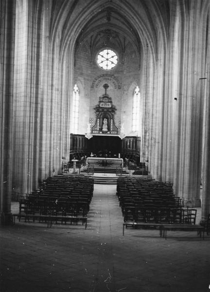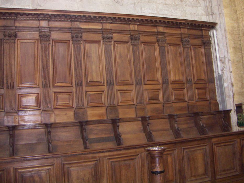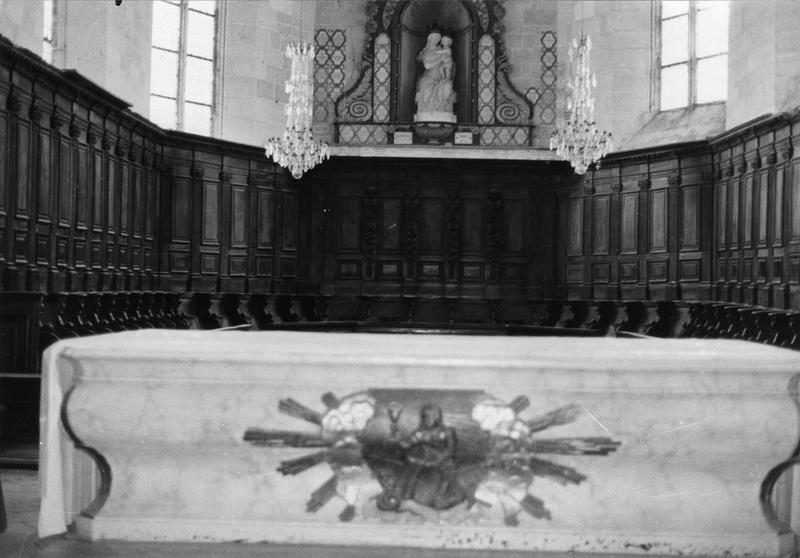 Ensemble composite ; les stalles ont été installées à leur emplacement actuel après la restauration de l'église terminée en 1669 ; elles proviennent soit d'une autre place dans l'église, soit d'un autre édifice ; elles ont été complétées par des boiseries formant dossiers contre les murs et clôtures prie-Dieu en avant, d'une architecture de style classique de la fin du 17e siècle ; cet aménagement ne comporte aucune stalle d'honneur ou de dignitaire ce qui confirme bien le réemploi, certaines stalles ayant disparu ou été détruites ; douze miséricordes anciennes ont été conservées ; deux autres composées de guirlandes et de feuillages sur corbeille godronnée doivent dater de la mise en place du 17e siècle.