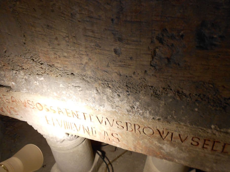 Le sarcophage repose sur une tablette qui elle-même repose sur des colonnes courtes à chapiteaux romans