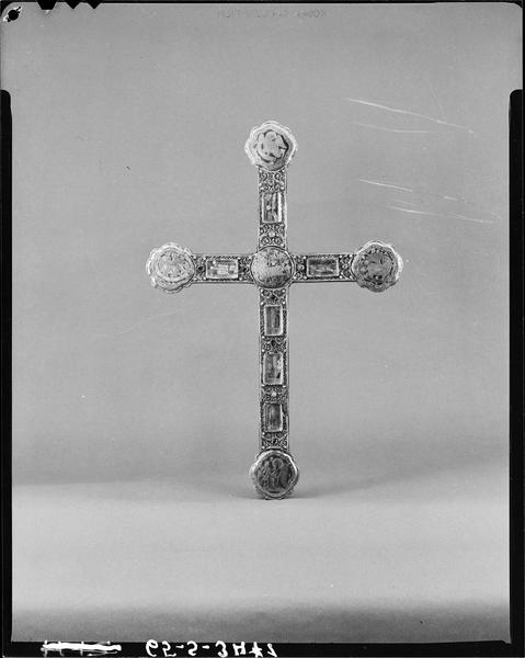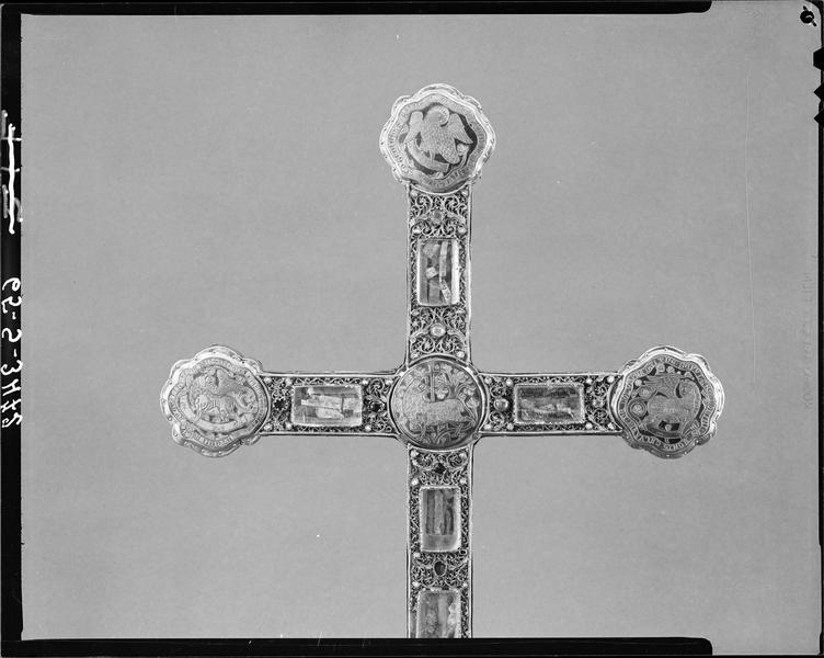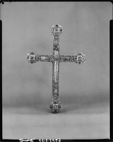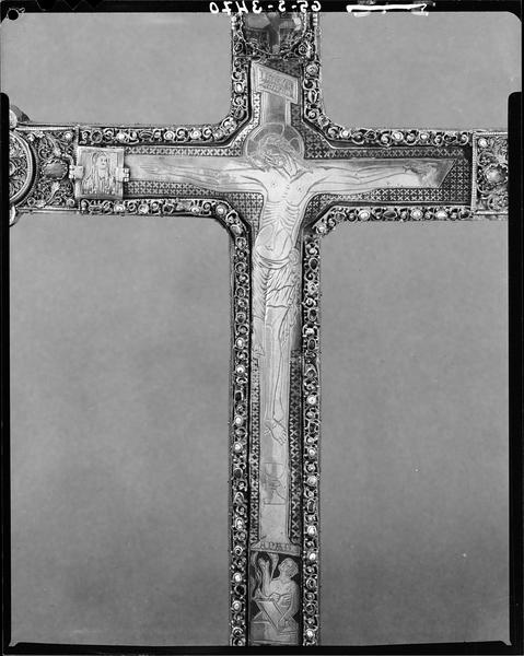 Croix-reliquaire en bois de chêne, entaillé de distance en distance pour recevoir des reliques, revêtu de lames d'argent ciselées, bordées de filigranes dorés et sertissant des pierres gravées antiques. Sur la face, la figure du Christ en croix est gravée sur fond croiseté, en réserve sur fond niellé. Au-dessus, Dieu le Père. Sous les pieds du Christ, un homme revêtu d'un suaire, sort d'un tombeau. La tige et les bras, revêtus de filigranes, autour de six logettes rectangulaires, renferment des reliques sous des plaques de cristal de roche.