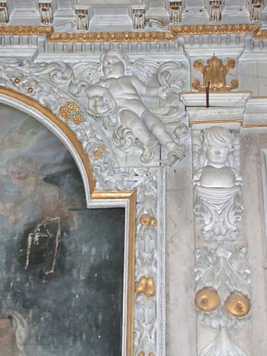 retable du maître-autel, tableau : La Sainte Famille, statues : Le Sauveur du Monde bénissant et tenant la boule terrestre, Vierge à l'Enfant jouant avec un oiseau éployé, Le Père Eternel, gradins d'autel, tabernacle (œuvre volée)