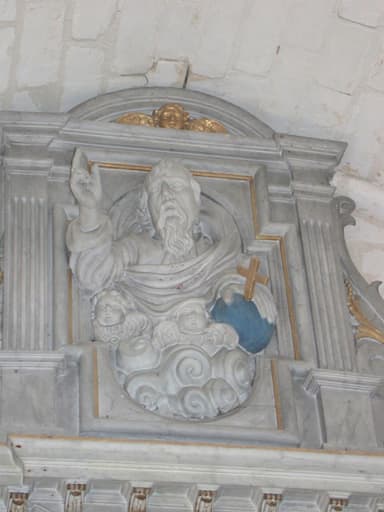 POP | Plateforme ouverte du patrimoineretable du maître-autel, tableau : La Sainte Famille, statues : Le Sauveur du Monde bénissant et tenant la boule terrestre, Vierge à l'Enfant jouant avec un oiseau éployé, Le Père Eternel, gradins d'autel, tabernacle (œuvre volée)