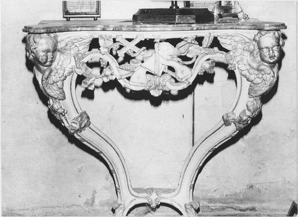 Crédences de style Louis XV, en bois peint blanc et or, avec dessus en marbre, l'une à décor d'objets liturgiques et de têtes d'anges, et l'autre à décor de fleurs.