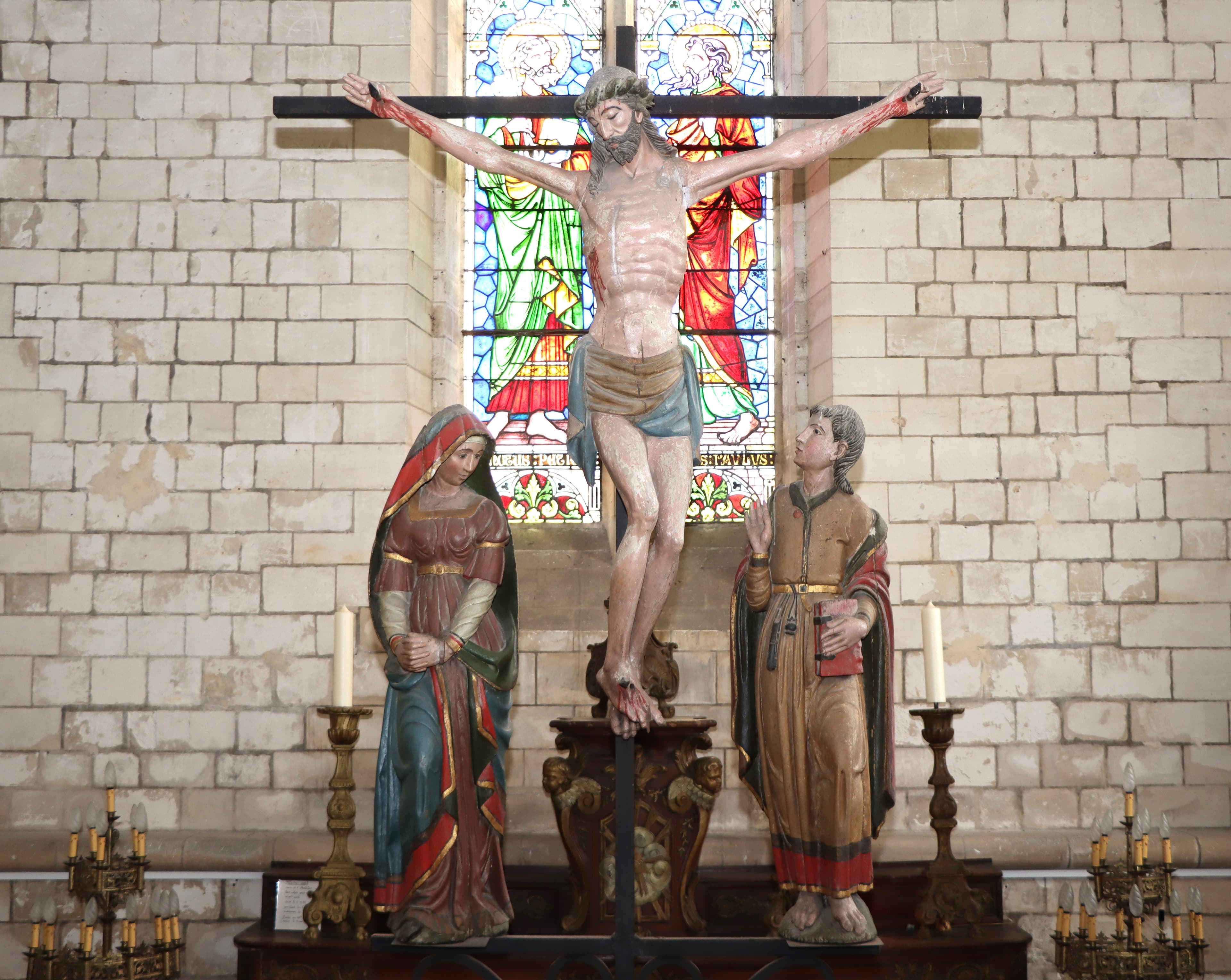 groupe sculpté : Christ en croix entre la Vierge et saint Jean