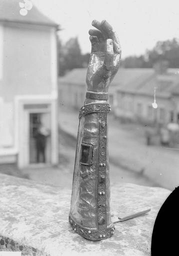 Bras-reliquaire en argent estampé sur âme de bois. Les parements sont en cuivre doré, et sont décorés de pierres, cabochons, pâtes de verre, ivoire, turquoises, agates, et de quelques pierres fines plus récentes. Le galon qui borde la couture de la manche antérieurement et le dessous du bras sont gravés. Sur un des côtés, une montre quadrangulaire laisse voir la relique.