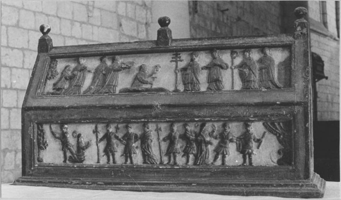 Le décor sculpté représente l'histoire de l'acquisition et de la venue des reliques à Picquigny. Les scènes sont argentées, les carnations des personnages rosées, les vêtements réhaussés de vernis colorés. .