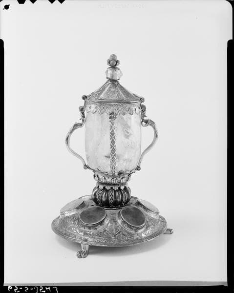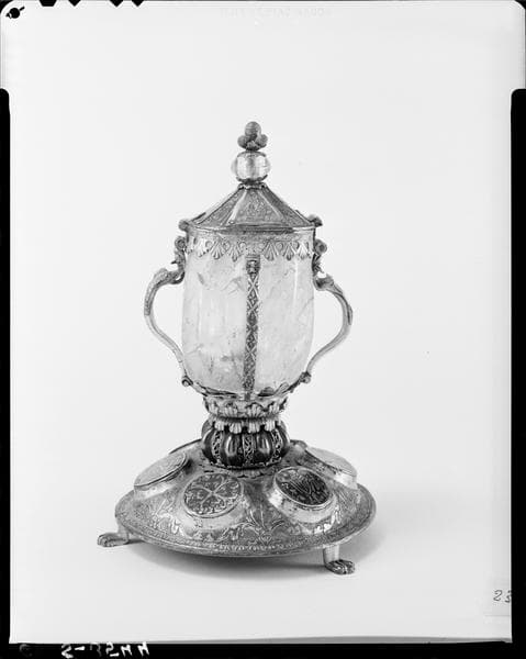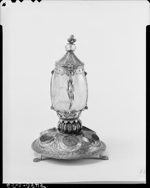 Reliquaire pédiculé composé d'un vase cylindrique en cristal de roche.