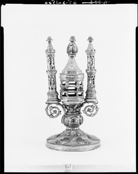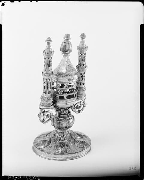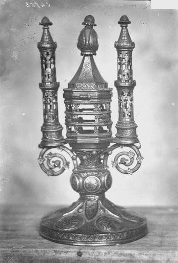 Custode octogonale garnie autrefois d'un tube de cristal, et surmontée d'un couvercle. Deux tourelles ajourées l'encadrent. Le pied, circulaire, est garni de médaillons niellés. Un chapiteau de feuillages contient la custode centrale.