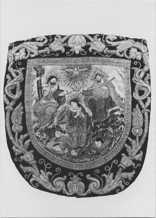 L'objet consiste en un chaperon de chape. Le sujet, le Couronnement de la Vierge, est brodé, et s'inscrit dans une bordure brodée en relief de motifs floraux, sur un fonds de velours rouge. Soie et or au passé empiétant.