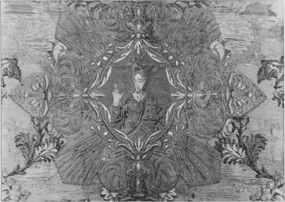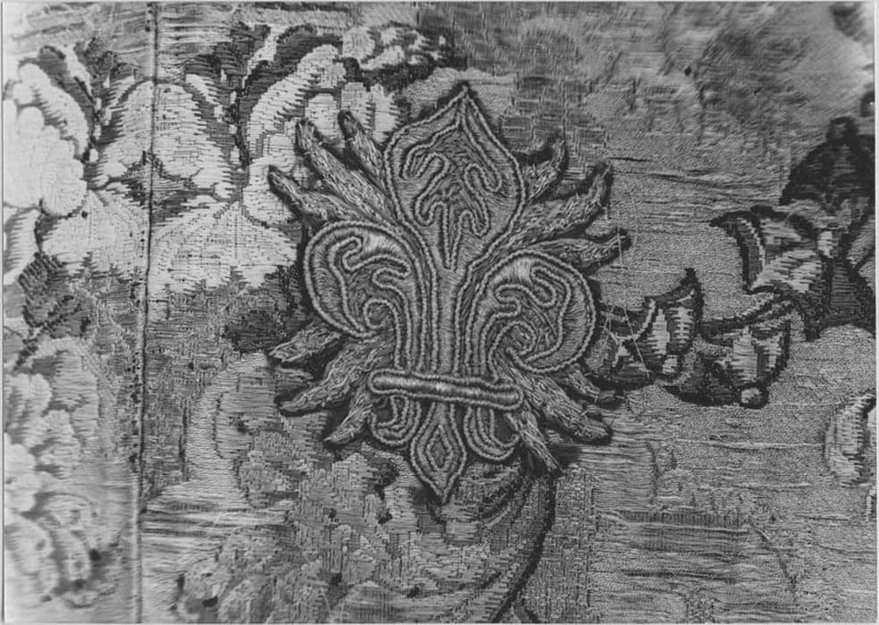 soie : brodé ; fil métal : doré, argenté ; matériau textile : broché