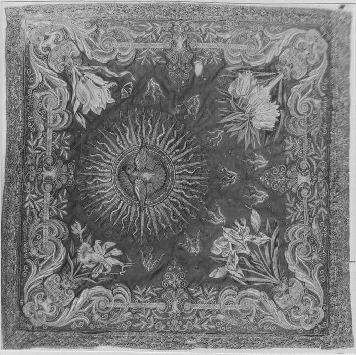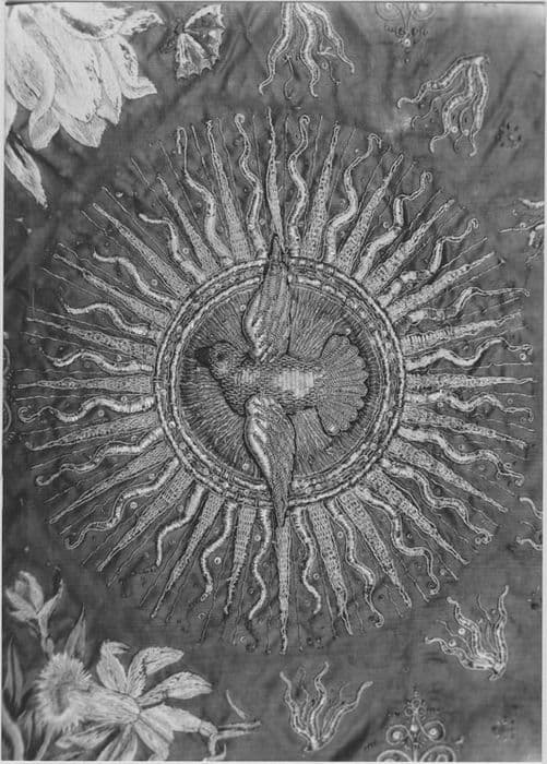 Un médaillon avec la colombe du Saint-Esprit se détache au milieu d'un motif rayonnant. Dans les angles inférieurs du voile, deux bouquets de fleurs. Sur un tissu de soie, broderies de fils de soie exécutées au point passé empiétant. Rehauts de cannetille. Dentelle d'or au fuseau sur le pourtour.