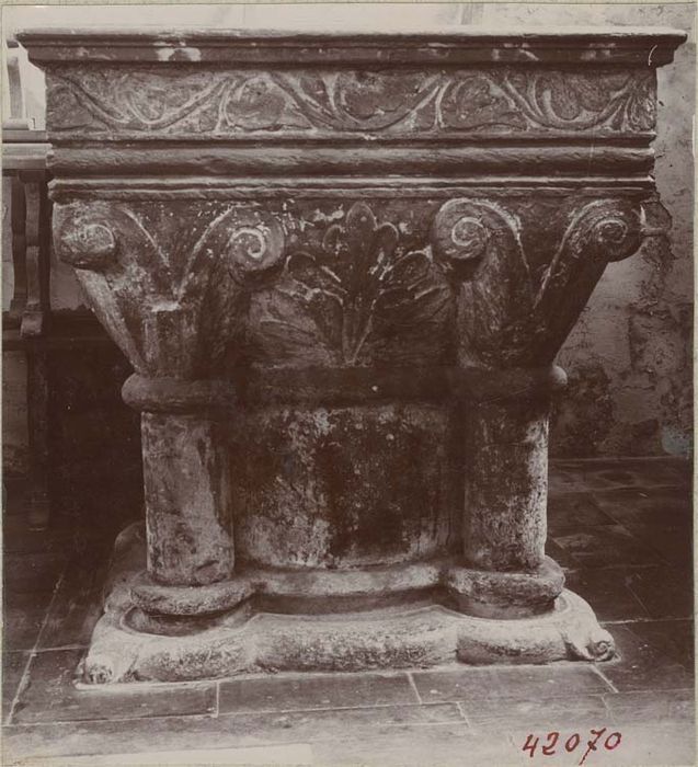 Cuve pédiculée flanquée de quatre colonnettes avec chapiteaux à crochets, le tout surmonté d'une frise ornée de rinceaux sculptés.
