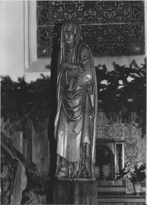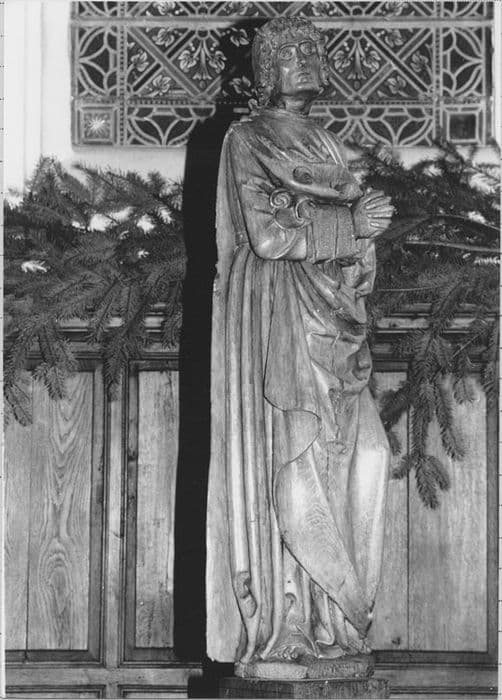 Ces statues, dont la polychromie a disparu, sont les éléments disjoints d'une poutre de gloire.