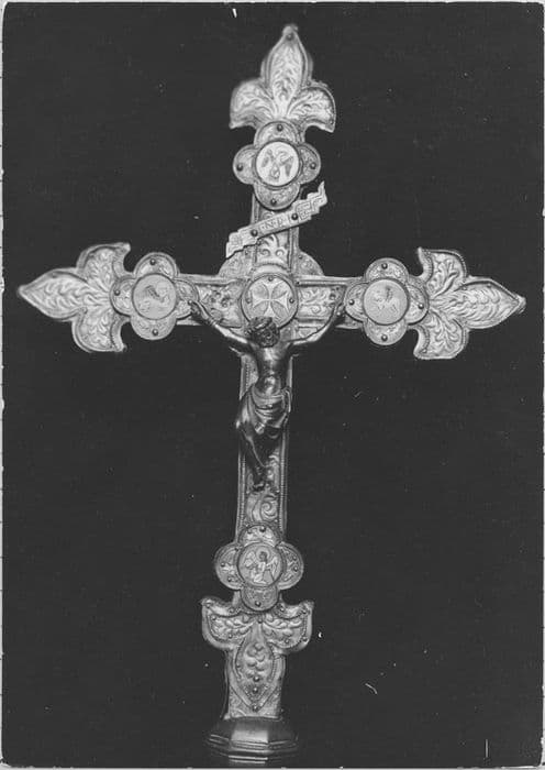Croix de procession constituée de lames de cuivre sur âme de bois et émaux.