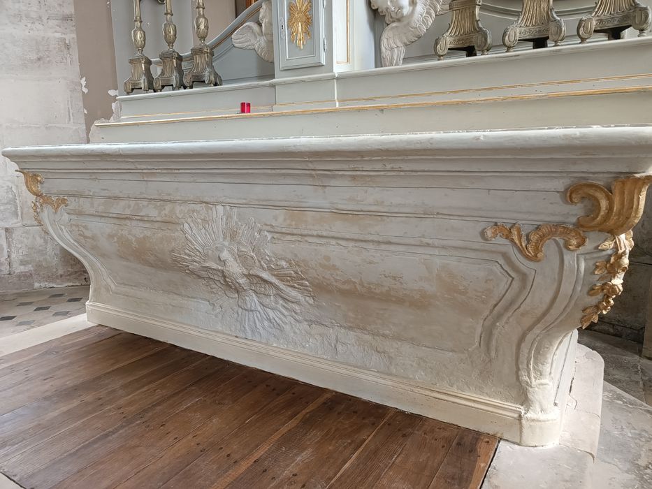 Le thabor est orné de deux petits anges adorateurs et sommé d'une couronne. Le devant d'autel porte un agneau pascal. De chaque côté du tabernacle, des têtes d'anges en relief (en saillie sur les volutes de la prédelle).