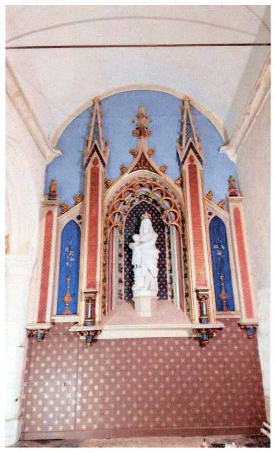 autel de la Vierge avec sa statue : Vierge à l'Enfant au type de Notre-Dame-des-Victoires et deux autres statues (statuettes) : Saint Antoine et Saint Laurent